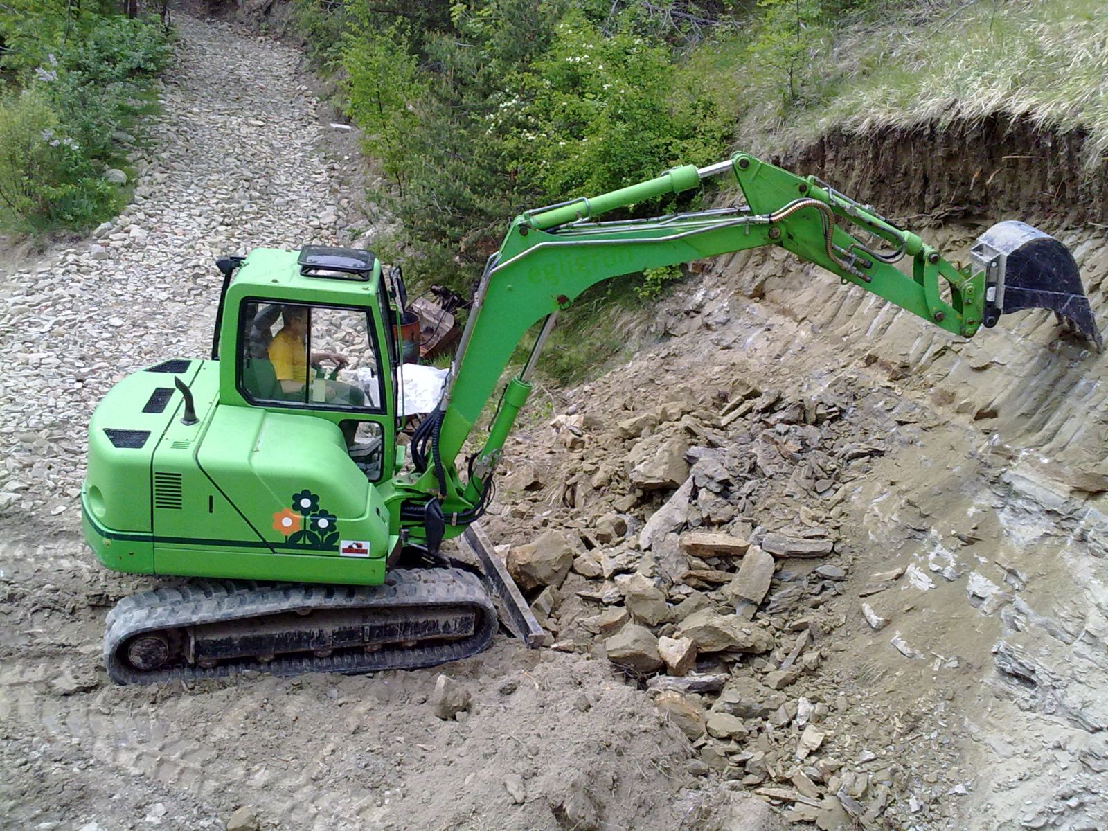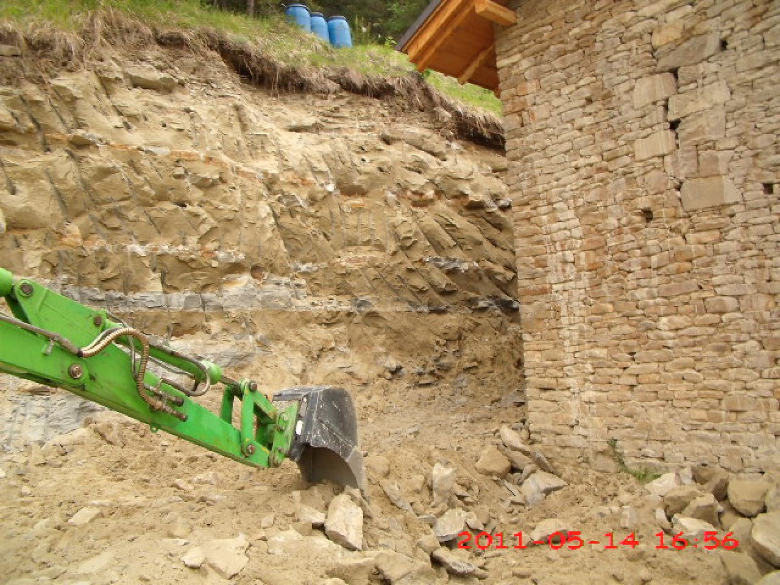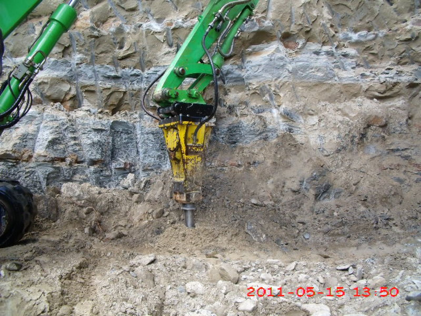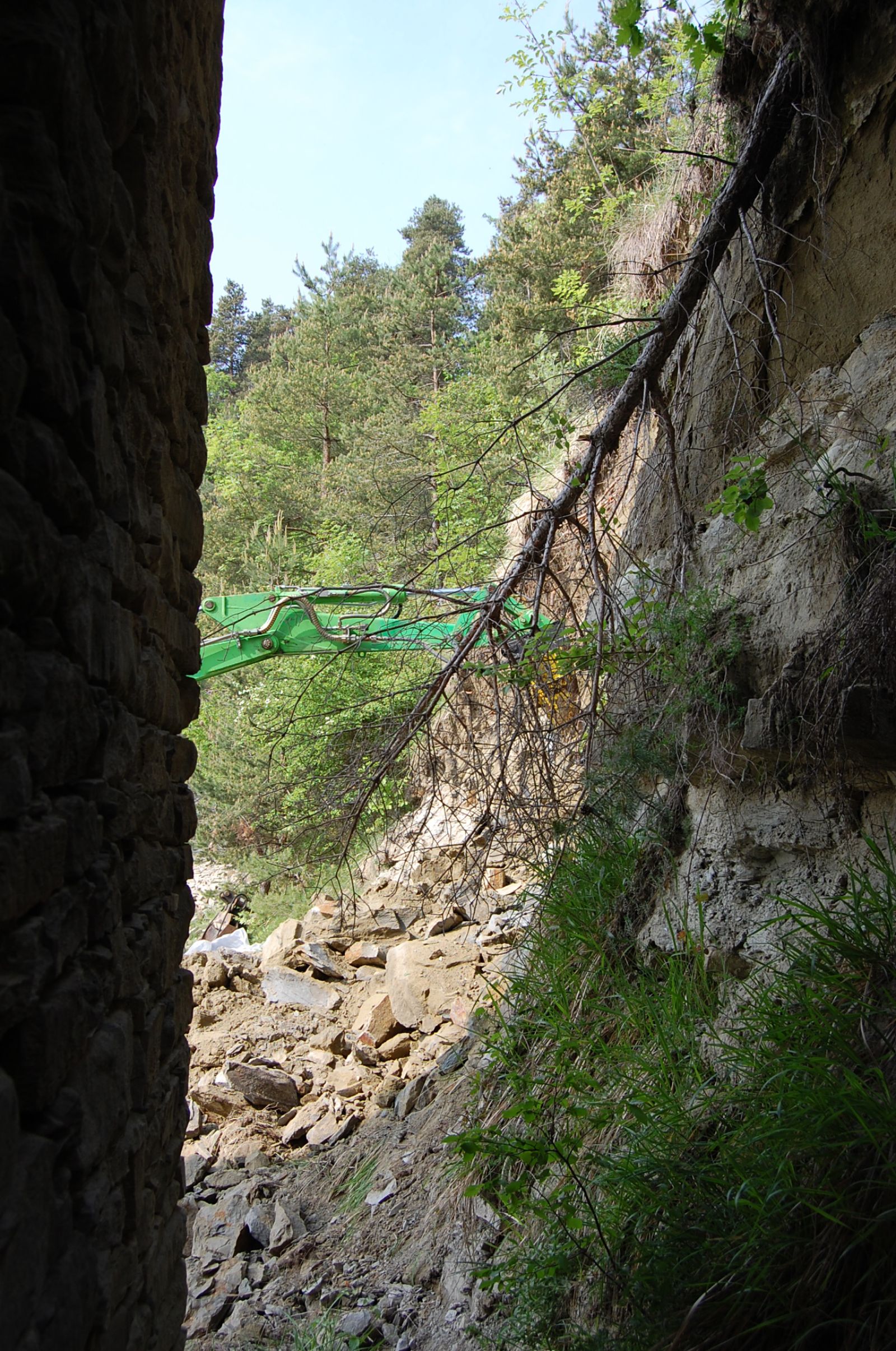 Jetzt darf auch der grosse Bruder in grün ans Werk. Die Felswand muss um einige Meter weichen.